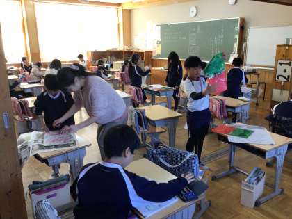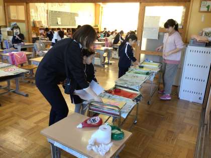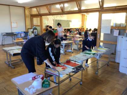 2年生の図工の授業です。紙を使って貼り絵のようにした台に、いろいろな色のインクを使って刷っていました。