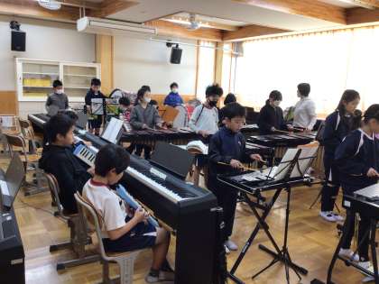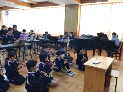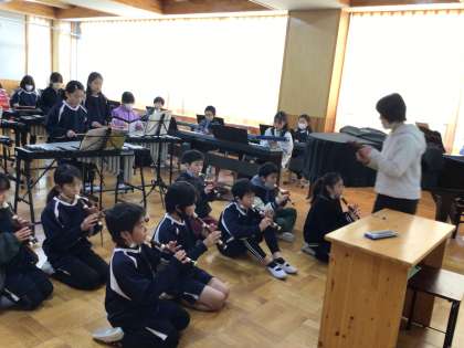 4年生の音楽の授業です。拍に合わせて、「茶色のこびん」の曲を合奏していました。