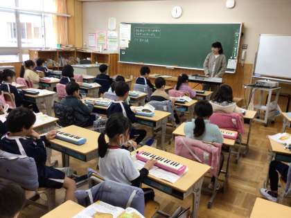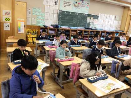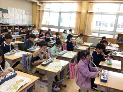 2/19 鍵盤ハーモニカ 2年生 公開日 2024/02/20 更新日 2024/02/20 各学年から 2年生の音楽です。鍵盤ハーモニカで「こぐまの2月」という曲を演奏していました。音をそろえるために、休符のところで、先生が手をパンとたたいていました。 2年