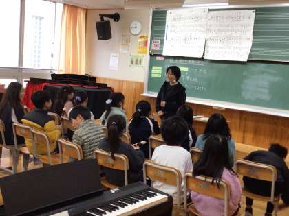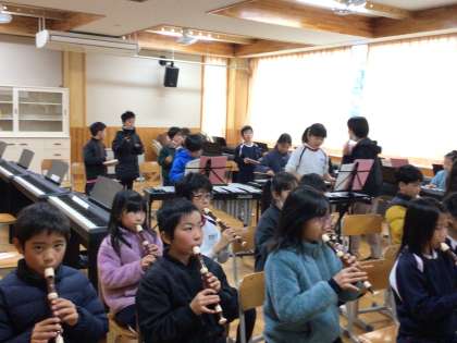 2/19 茶色のこびん 3年生 公開日 2024/02/20 更新日 2024/02/20 各学年から 3年生の音楽の授業です。「茶色のこびん」の合奏をしていました。拍を感じて合わせて演奏するために、この日は「指揮をよく見よう」という目標で練習をし、授業の最後には、その目標について振り返りをしていました。 3年