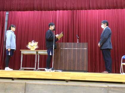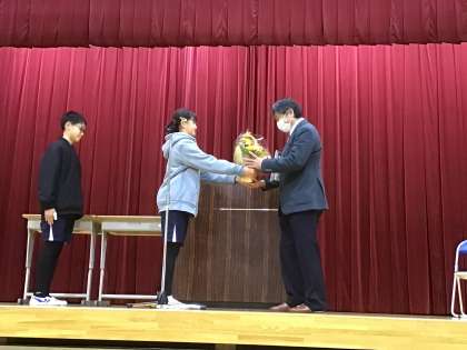 開校以来10年間、朝日小学生新聞を寄付してくださっている(株)大谷商事様に感謝する会をひらきました。図書委員会の代表児童から、社長様に手作りの感謝状と花束をお渡ししました。図書委員会は、先日の児童集会で、朝日小学生新聞について発表しました。