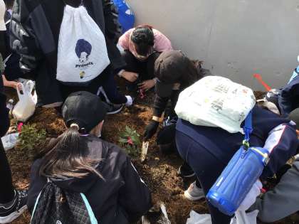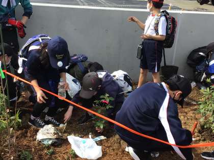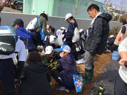 2/20 植樹 6年生 その2 公開日 2024/02/21 更新日 2024/02/21 各学年から 2人で1本の苗を持ち、バスに乗り込みました。真新しい博物館の一室に入れていただき、説明を聞きました。 植える場所に移動し、植樹の作業を開始しました。前日の雨で土が柔らかくなっていましたが、しっかり深く掘らなくてはいけません。「このくらいでいいですか?」と博物館の方にお聞きしながら、穴を掘りました。 6年