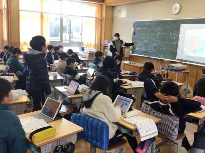 5年生の算数、プログラミングの授業です。多角形をかくプログラムを作っていました。ICT支援の先生に入ってもらっている授業でした。角度を求める場面では、きちんと自分の言葉で説明ができていました。