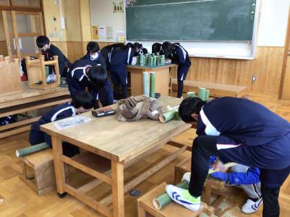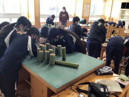 2/28 プレゼント作り 6年生 公開日 2024/02/29 更新日 2024/02/29 各学年から 6年生が、学校へのプレゼントとして、クラスのプレートを作っていました。「まごころの森の物を使って作りたい」と考え、森の竹を使って作りました。明日の送る会でお披露目をするそうです。 6年