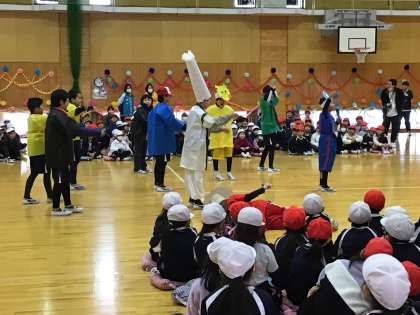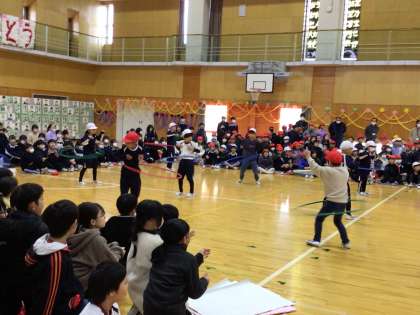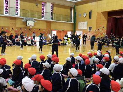 2/29 6年生を送る会 その4 公開日 2024/02/29 更新日 2024/02/29 学校行事 5年生進行による「6年生と対決」です。それぞれの学年の種目について、6年生と競いました。1年生はフラフープ対決です。制限時間内にフラフープをやり続けた人の数で競いました。僅差で勝った1年生は、とても喜んでいました。 行事