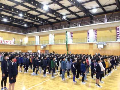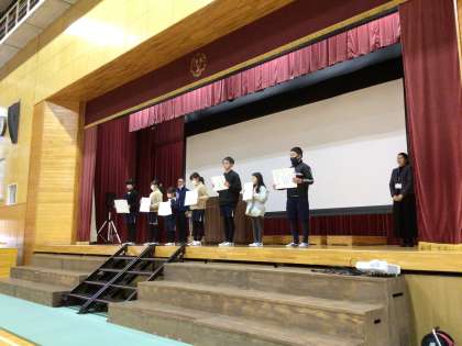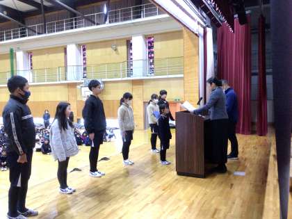 今週の月曜日の全校集会の様子です。いろいろなコンクール等の表彰を行いました。また、「感謝の会」で歌う歌の練習を行いました。