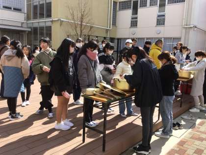 3/9 まごころ清掃 その5 公開日 2024/03/09 更新日 2024/03/09 学校の特色ある活動 まごころ清掃のお楽しみは、共働本部・PTCAの方々が用意してくださった中華スープです。持参したお椀についでもらい、子どもも大人も舌鼓を打ちました。おにぎりを持ってきて昼食にしている子もいました。「おいしい!」とお代わりの列に並んでいる子どもがたくさんいました。朝早くから準備をしてくださった共働本部・PTCAの皆様、ありがとうございました。 PTCA 地域学校共働本部