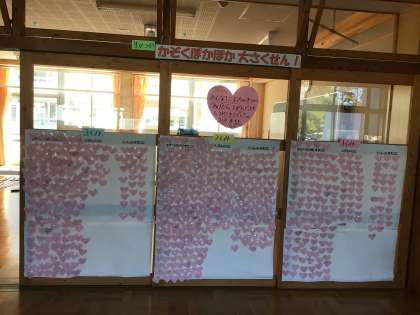 1年生の生活科の活動についての掲示です。「家族ぽかぽか大作戦」として、「家族のためにできること(お手伝いなど)をする」「自分でできることを増やす」「家族と触れ合う」ことを自分たちで考え、実践しました。ハートカードに、自分がしたことや家族の反応を書き込み、掲示することで、活動を広げています。