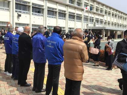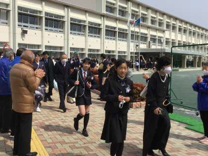 門までの間、たくさんの人たちから「おめでとう」の言葉のシャワーを浴びます。卒業生が入学したころから、ずっと見守ってくださっているスクールガードの皆さんをはじめ、地域の方々も見送ってくださいました。