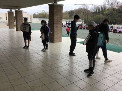 今年度初めての一斉下校です。6年生の企画委員が、「静かに並ぼう」と、ポスターを使って呼びかけました。1年生は、テラスに並び、6年生のお迎えを待ちます。6年生と一緒に一斉下校の場所に並んだら、みんなで「さようなら」をします。1年生が一斉下校の場所を覚え、自分で行けるようになるまで、段階的に進めていきます。