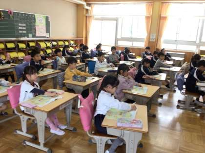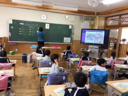 1年生の昨日の様子です。算数の授業では、絵の中から仲間を見つけて丸で囲んだり(鳥の仲間、花の仲間など)声を出して数を数えたりしていました。大きなテレビに絵を映して、数えるところがよく分かるようにしていました。