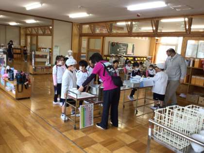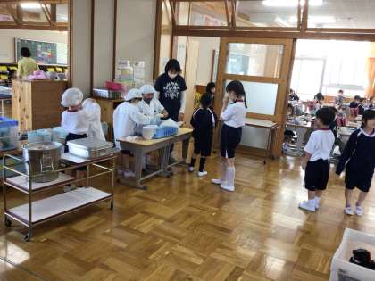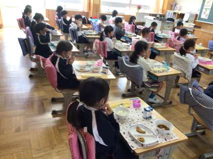 1年生の給食準備の様子です。1年生の給食が始まって3回目。少しずつ要領がわかってきました。今は4時間目の時間も使っていますが、徐々に準備の時間が少なくなっていくと思います。準備ができたら、みんなで「いただきます。」自分に合わせた量の調節もしています。