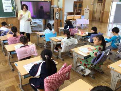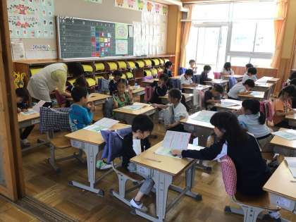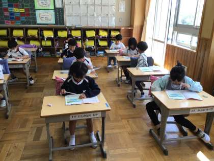 4/17 線でむすんで 1年生 公開日 2024/04/17 更新日 2024/04/17 各学年から 1年生の算数の授業です。どちらが多いかを調べるために、一つずつ線でむすんで、どちらが余っているかを調べていました。担任がすばやくまわり、丸をつけたり、方法がわからない子に助言をしたりしていました。 1年