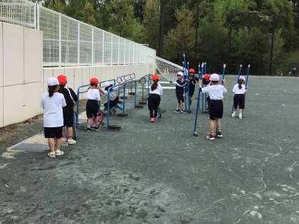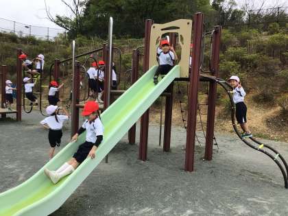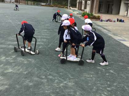 1年生の体育の授業です。遊具の使い方を習い、安全に遊ぶためのルールも教えてもらいました。一輪車や竹馬のある場所も分かりました。