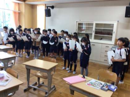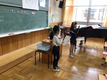 3年生の音楽の授業です。「ハッピーソング」という歌を歌っていました。1番から4番のどれを歌うかでグループを作り、声を合わせて歌っていました。