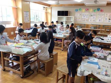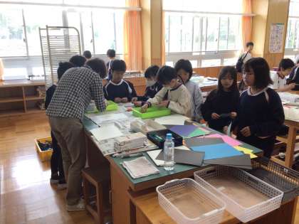 4年生の図工です。絵具を使って、様々な表現技法を試しています。マーブリングという技法を教えてもらいながら試している班がありました。慎重に絵具を落としていました。