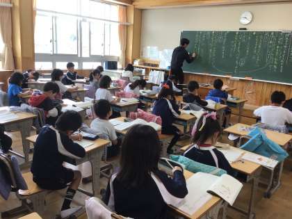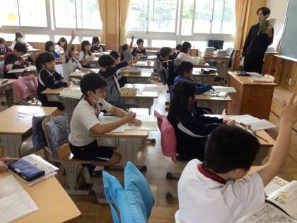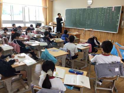 3年生の国語の授業です。「すいせんのラッパ」という物語を、様子を想像しながら読み、音読に生かす学習です。登場人物の様子を表す言葉を見つけ、発表していました。
