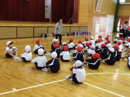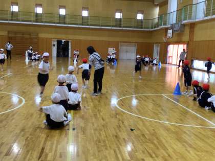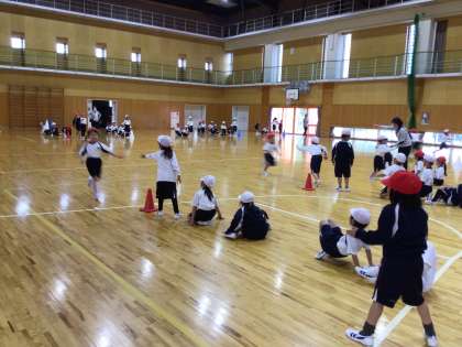 1年生が学年で体育をしていました。リレー遊びを楽しそうにしていました。ゲームを通して、終わったらよい姿勢で待ったり、指示を聞いて並びなおしたりすることもできるように支援しています。「この班はよい姿勢だね。」「どこの列が静かに並べるかな。あ、ここが早いね。」等の声かけに素直に反応し、整列等もゲームのように楽しんでいました。