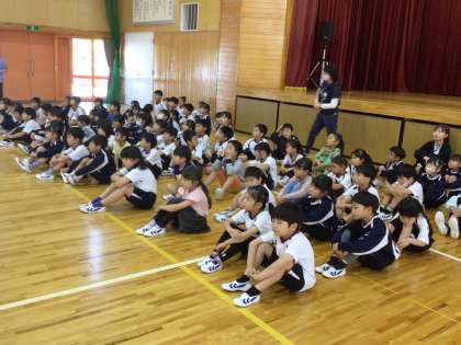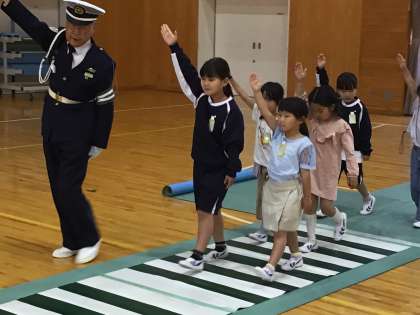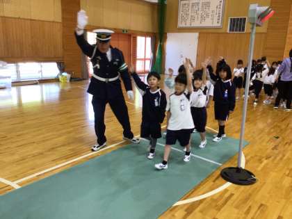 4/25 交通安全教室 1年生 公開日 2024/04/25 更新日 2024/04/25 各学年から 1年生の交通安全教室が学校の体育館で行われました。豊田市の交通安全協会の指導員の方8名がご来校され、1年生にお話と実技指導をしてくださいました。 信号のある横断歩道、踏切や信号のない交差点を、どのように渡ったらよいかを教えていただきながら、グループごとに実際に渡りました。 1年