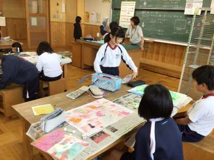 4年生の図工の授業です。絵具を使って、様々な技法に挑戦してきました。それらの模様を使って、切ったり貼ったりして作品に仕上げていました。