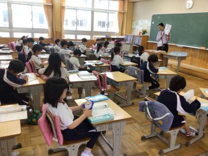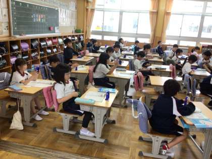 2年生の算数の授業です。時計の模型を自分で動かしながら、時間や時刻に関する問題を考えました。60分で1時間になることも学習しました。