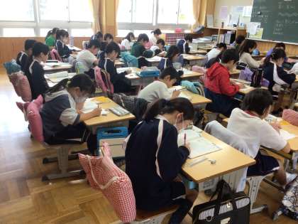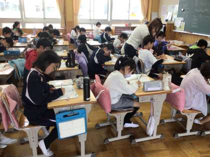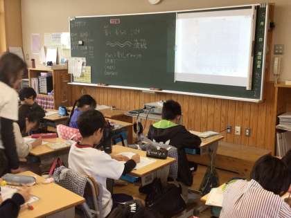 4年生の算数の授業です。折れ線グラフを書いていました。グラフを大きく映したもので書き方のポイントを学習した後、自分で書きました。