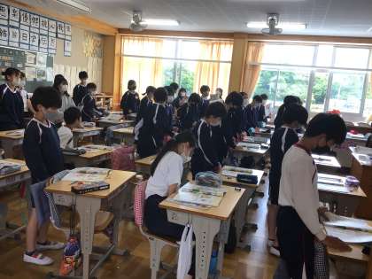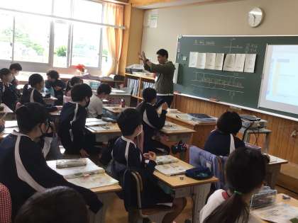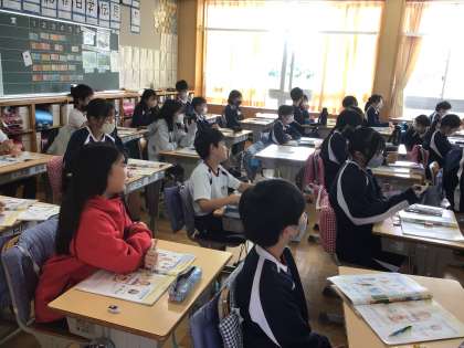 6年生の英語の授業です。「私は〇時に起きます。」という言い方を習い、友達と話をしていました。