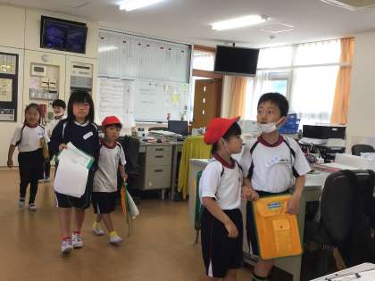 5/21 学校探検 1・2年生 公開日 2024/05/21 更新日 2024/05/21 各学年から 1・2年生の生活科の授業です。2年生は事前に準備をし、1年生を探検に連れていきます。この部屋はどんな部屋なのか、その部屋に入るときはどんなことに注意をするのか等、説明できるように練習もしました。 職員室に入るときにも、入り口でしっかり挨拶をしました。2年生が先に名乗り、1年生がそれに続けて名乗っていました。 1年 2年
