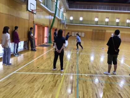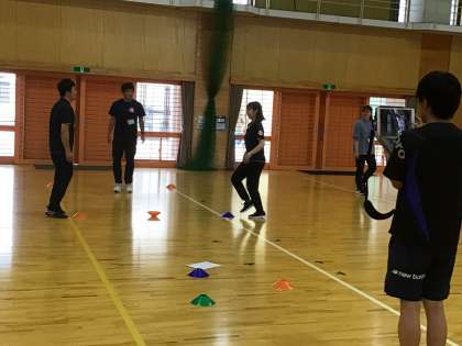 教員のミニ研修「ちょこっと現教」の様子です。授業で使えるコーディネーショントレーニングについて、実際にやってみながら学びました。