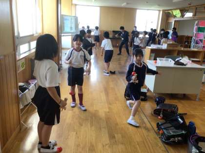 けん玉クラブは、教室とワークスペースを広く使って練習です。「こんなこともできるよ。」と見せてくれました。