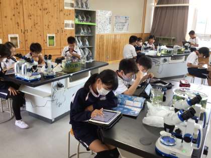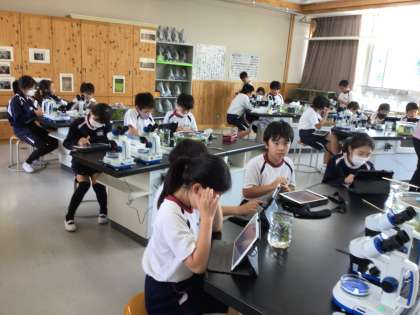 5年生の理科の学習です。メダカの卵を顕微鏡で観察しました。顕微鏡で見える卵の写真を写真に撮り、学習用タブレットの発表ノートにまとめました。