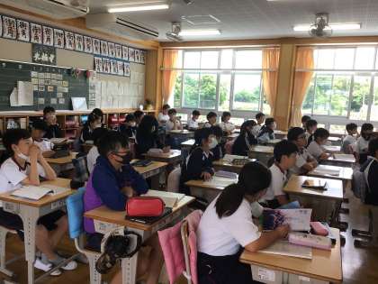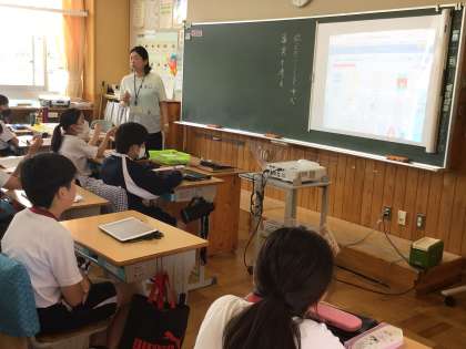 6年生の国語の授業です。防災について一人ずつ提案をまとめ、学習用タブレットで提出をしました。それを見合いながら、作品のどこがよかったかを考えました。