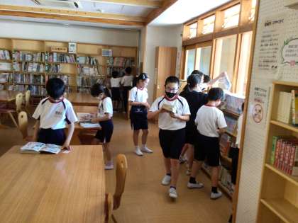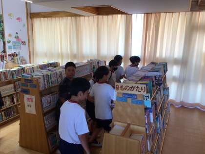 授業の余った時間で、担任がメディアセンターに連れていき、本を借りていました。私が聞くと、借りた本を見せてくれました。伝記を探そうと思い、尋ねると、「ここです。」と案内してくれました。