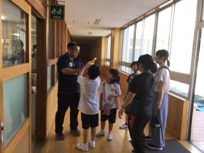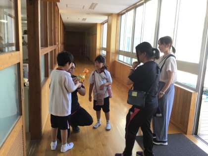 おひさま組・にこにこ組・ひだまり組が、畑の悩みを解決すべく、野菜に詳しい教員に聞きにきたところです。「野菜の葉っぱに虫がついてしまったので、どうすればよいですか。」と聞き、薬を教えてもらいました。きちんとお礼が言えました。