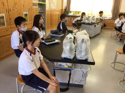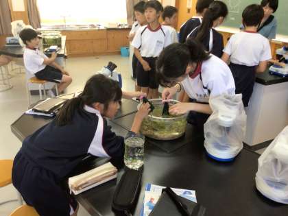 5年生の理科の授業です。メダカの卵を顕微鏡で観察した後、産みつけられた卵を取ったり、メダカにエサをやって様子を観察したりしていました。