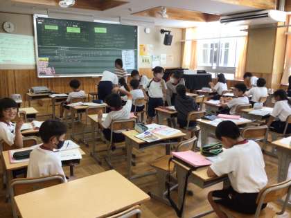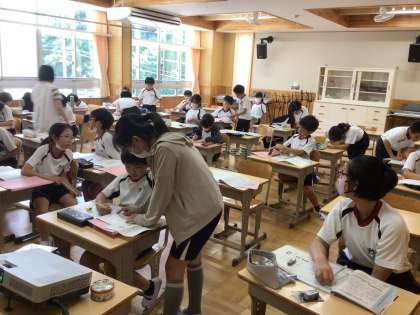 5年生の音楽の授業です。音の重なり方の違いに気をつけて聴きました。写真は、プリントの楽譜に階名を書き込んでいるところです。分からないところは、友達と一緒に考えています。