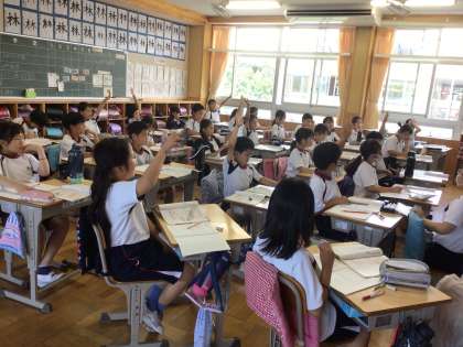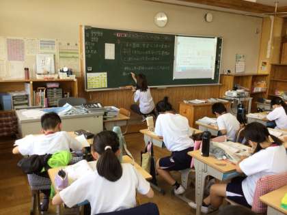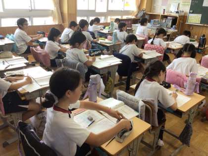 4年生の算数の授業です。1本の直線に垂直な線は平行になることを、長さを測って調べました。また、身近にある平行な線を見つけ、発表しました。