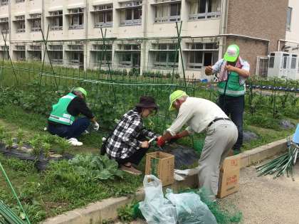 畑ボランティアの皆様が来校され、2年生と4年生の畑に支柱を立ててくださいました。途中、子どもたちが畑に来て、作業を見せていただいたり、ミニトマトの世話をしたりしました。子どもたちは、畑ボランティアの方々にお礼を言いました。