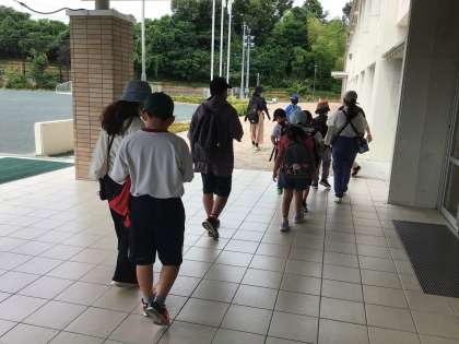 おひさま組・にこにこ組・ひだまり組が、フェルナへ出かけていき、買い物学習をしました。写真は、出かけるときの様子です。大きな声で「行ってきます。」はりきって出発です。