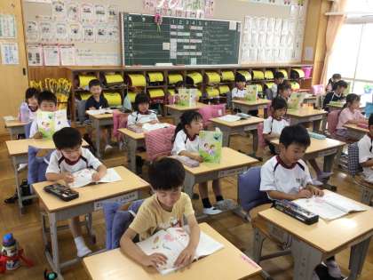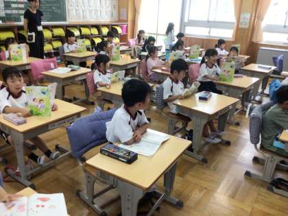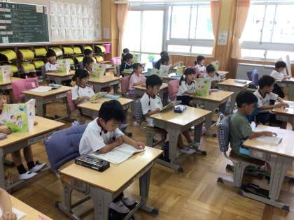 6/25 ことばあそびうた 1年生 公開日 2024/06/25 更新日 2024/06/25 各学年から 1年生の国語の授業です。ことば遊び歌をリズムよく読めるように、キーボードのリズムを流して、それに合わせて読んでいました。「ちょっと速くするよ。読めるかな。」という教師の言葉に、読む姿勢を整えて挑戦する子どもたちです。 1年
