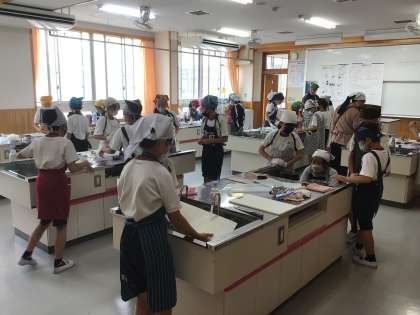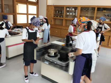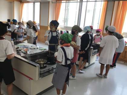 5年生の家庭科の授業です。キャンプに向けて、カレー作りを行いました。ポイントは水の量。さあ、おいしいカレーができたでしょうか。グループで協力して活動していました。