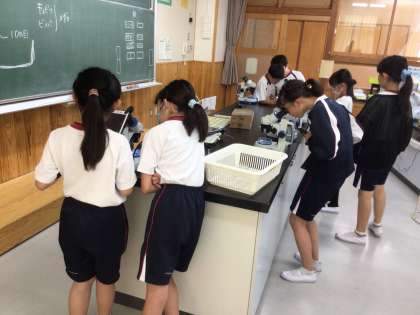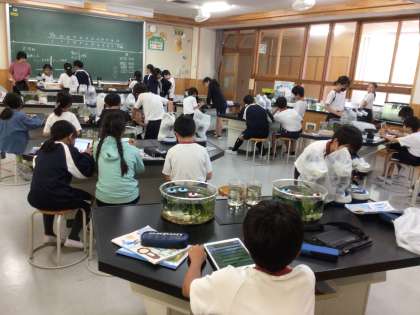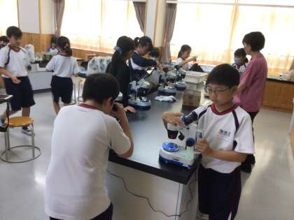 5年生の理科の授業です。孵化間近のメダカの卵を顕微鏡で観察していました。「見て。中で動いている!」「身体がよく見える!」と夢中でした。学習用タブレットで写真を撮り、発表ノートに貼ってまとめをしていました。