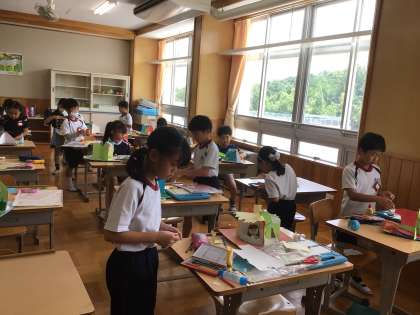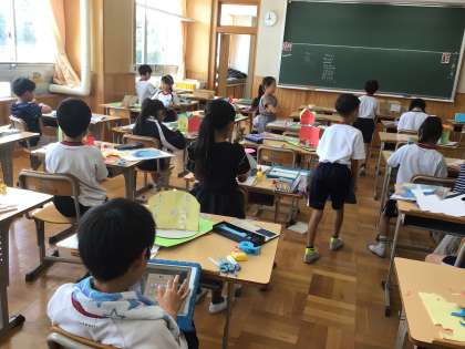 3年生の図工の授業です。くるくる回して場面が変わる工作を作り、その作品を発表するために、学習用タブレットで撮影をしていました。写真を何度も撮っているので尋ねたら、作品を動かしながら何度も撮影することで、コマ送りのようにして、発表をするのだそうです。回すことで場面が変わる作品だからこその発表の方法を工夫していました。