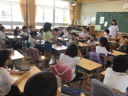4年生の理科の授業です。豆腐の容器の中には、どうして水が入っているのかということについて話し合っていました。「味のことではなくて、今まで勉強した空気と水の性質のことで考えてみて。」という教師の言葉に、次々に手を挙げ、友達の意見に付け足しをしながら話していました。