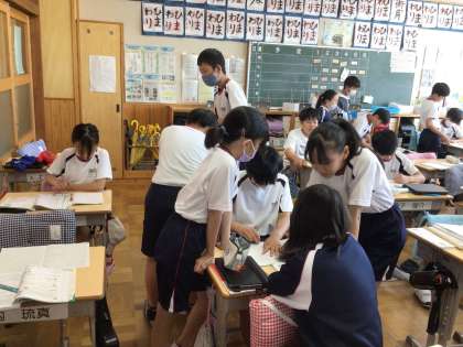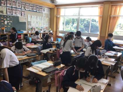 6年生の算数の授業です。組み合わせが何通りあるかという問題を考えていました。自分でじっくり考えるか、友達と一緒に考えるか選択できます。表にしたり線で結んだりして考えていました。