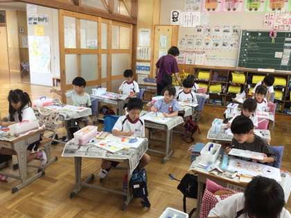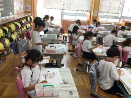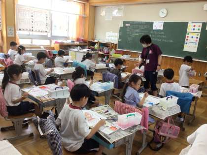 7/8 絵の具 1年生 公開日 2024/07/10 更新日 2024/07/10 各学年から 1年生の図工の授業です。魚の形を印刷した紙に、クレヨンで線を入れ、絵の具を使って塗りわけていきます。絵具を初めて使うので、水入れやパレットの使い方、絵の具や水をどのようにどこで混ぜるかを学びました。学んだことを確認しながら、世界で一つだけの魚を完成させていきます。 1年