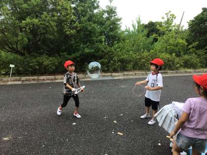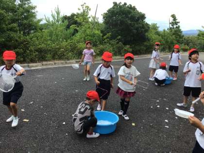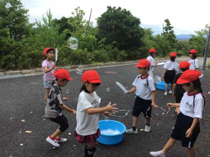 1年生の生活科の学習です。夏となかよしという学習で、シャボン玉遊びをしました。ハンバーやストロー、段ボール等を使って、シャボン玉をしていました。遊びながら、「こうすると大きいのができるよ。」「見て見て。上の方にしゅっとやるときれいだよ。」等、見つけたことをみんなに言っていました。