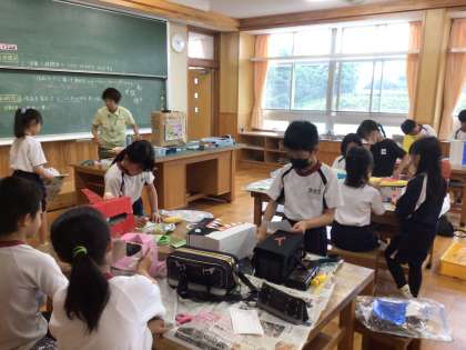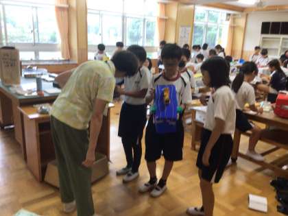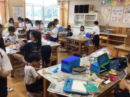 7/12 段ボールボックス 4年生 公開日 2024/07/12 更新日 2024/07/12 各学年から 4年生の図工の授業です。段ボールを使って、形や仕組みを工夫する作品が、ほぼ完成でした。「このひもを引っ張るとふたが閉まります。」「僕のすきな恐竜の形にしました。」等、詳しく説明をしてくれました。 4年