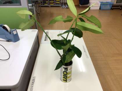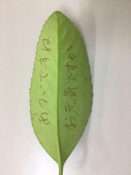はがき=葉書 の木です。葉っぱに針金で文字を書いたらくっきり浮かび上がってきました。子どもたちも興味をもったそうです。