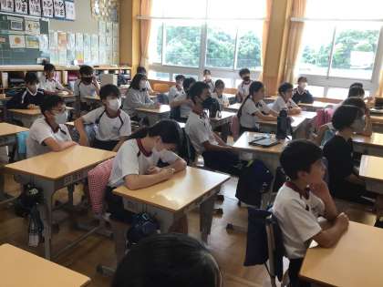 全校どの学級も、安全で元気に過ごせるよう、夏休みの生活について、資料や動画をもとに指導しています。